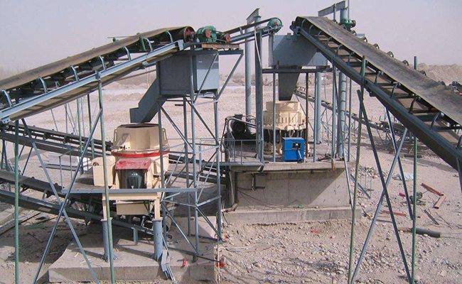 时产200-250吨河卵石制砂设备,通过自卸车将小于210mm的石料送入振动给料机,振动给料机把石料均匀的送入CS高效弹簧圆锥破碎机,圆锥破对石料进行第一段破碎后,通过圆振筛将大于40mm的返回圆锥破重新破碎,40mm以下的石料送入制砂机,最后,通过圆振筛对成品料进行分级筛分,由皮带输送机输送至成品区。