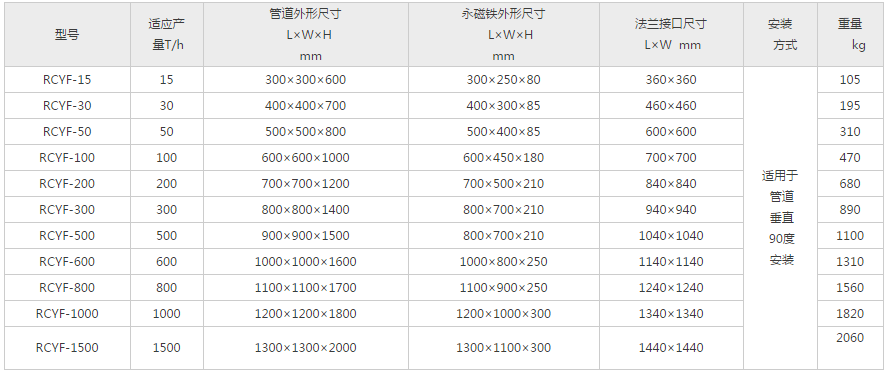 RCYF型垂直管道式永磁除铁器适用于水泥、建材、化工、粮食、塑料、煤炭、耐火材料等行业的粉状、颗粒状、块状物料的除铁,可与输送管道连接,垂直安装使用。